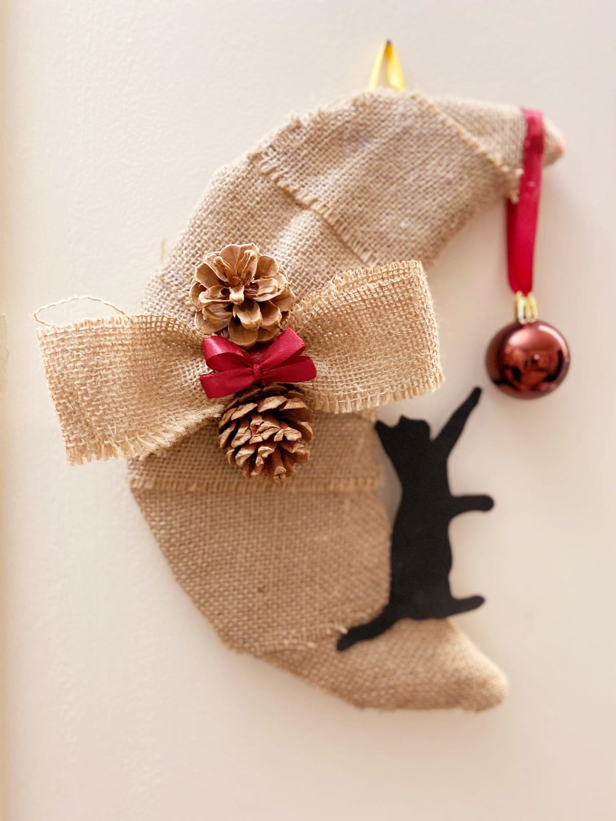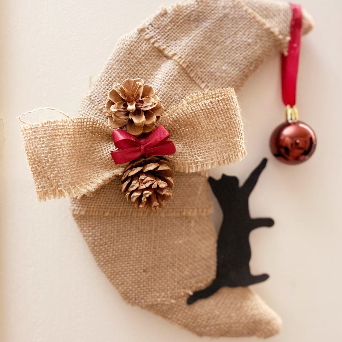 Un simpatico gatto di carta eva siede su una luna in juta, decorata con pigne naturali e un nastro in raso che regge una brillante pallina di Natale. È il dettaglio perfetto per chi cerca una decorazione natalizia fuori dal comune.