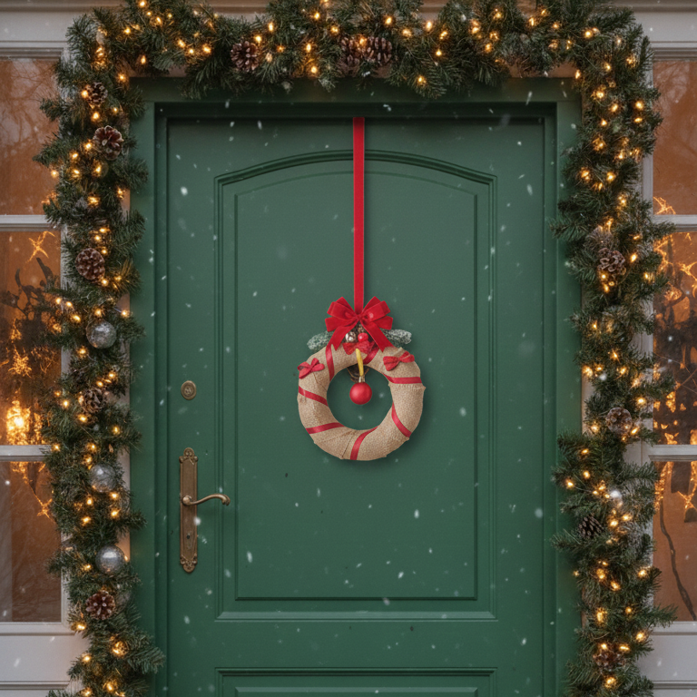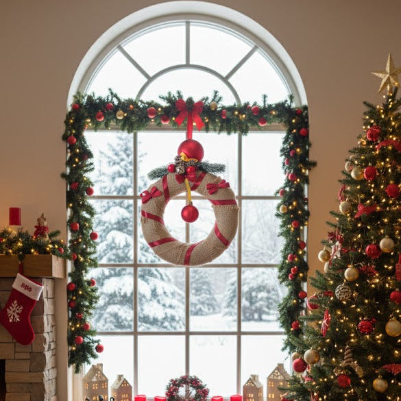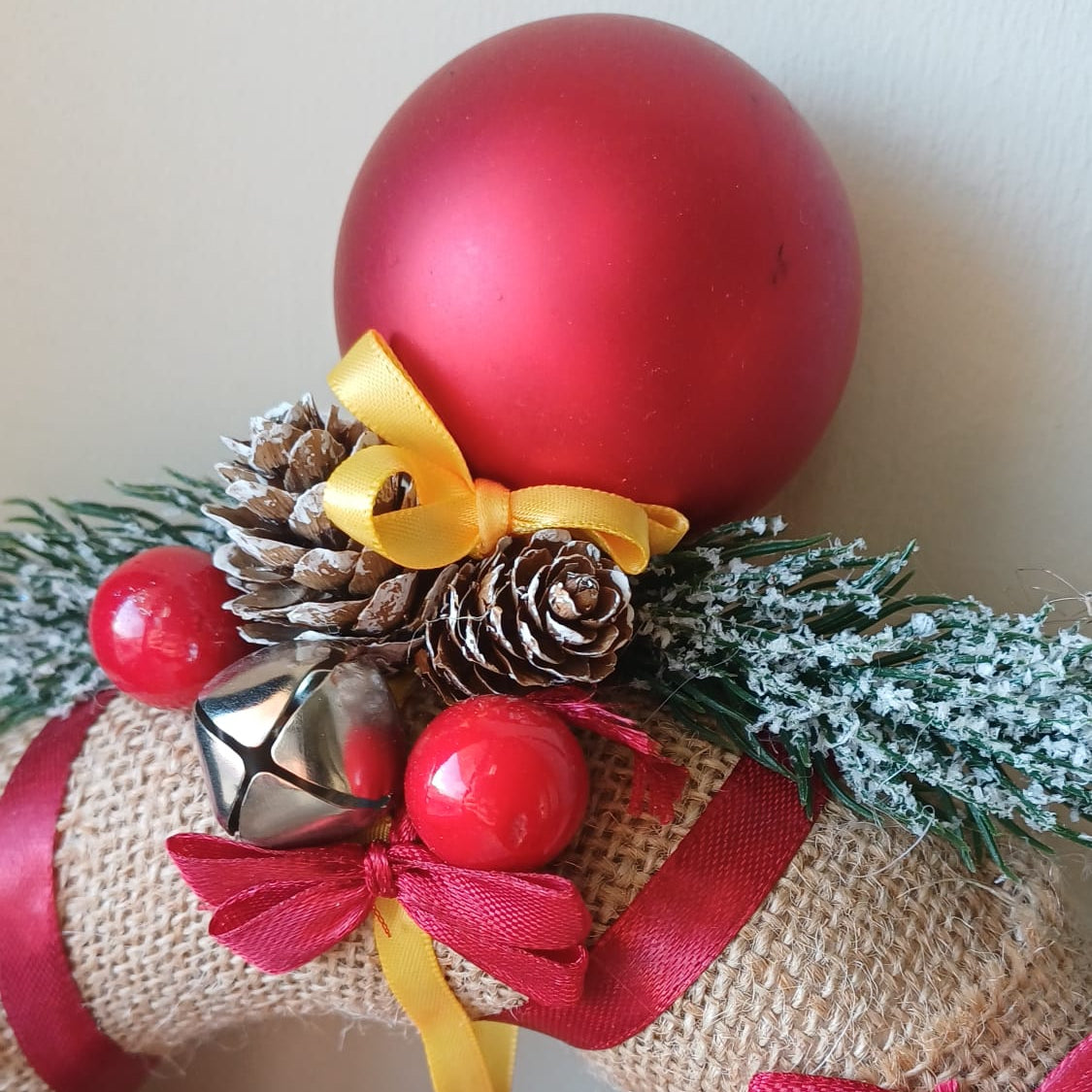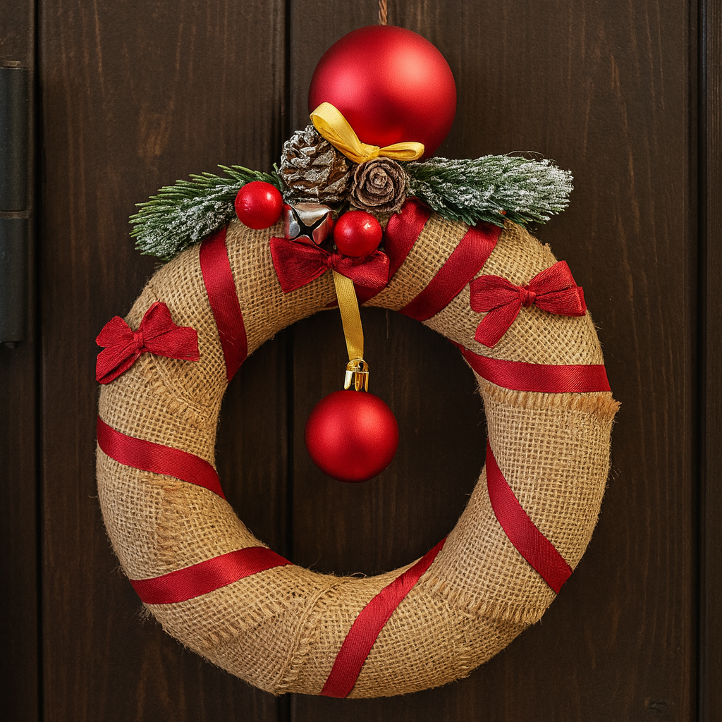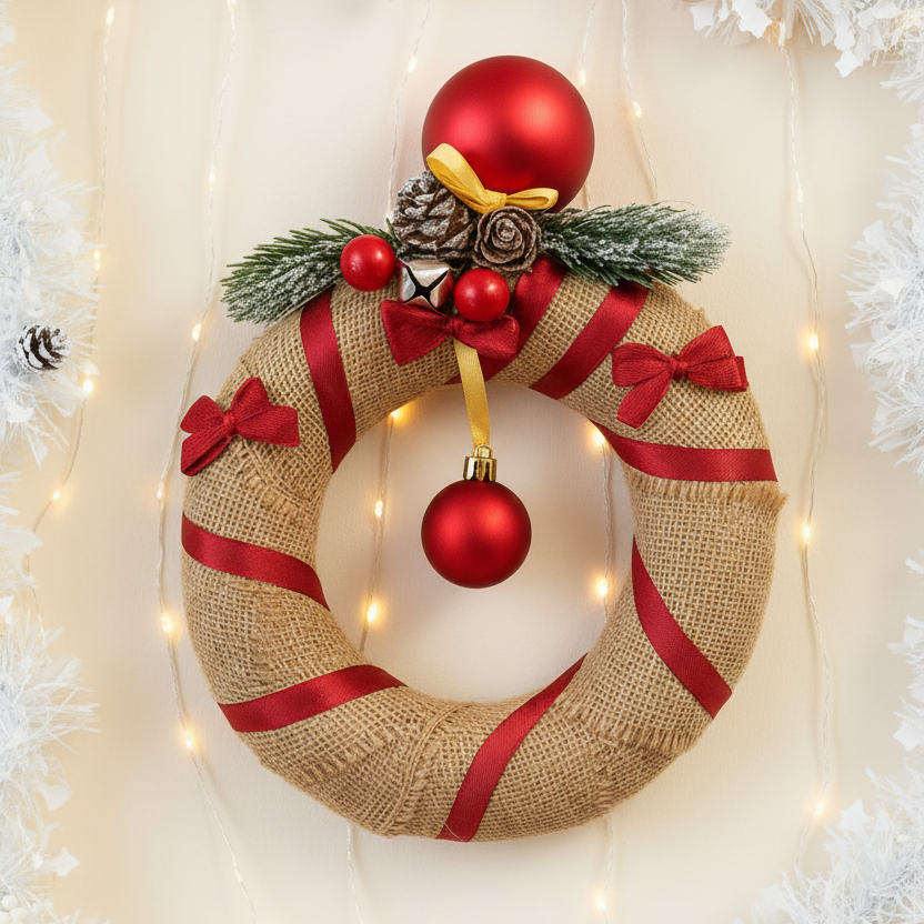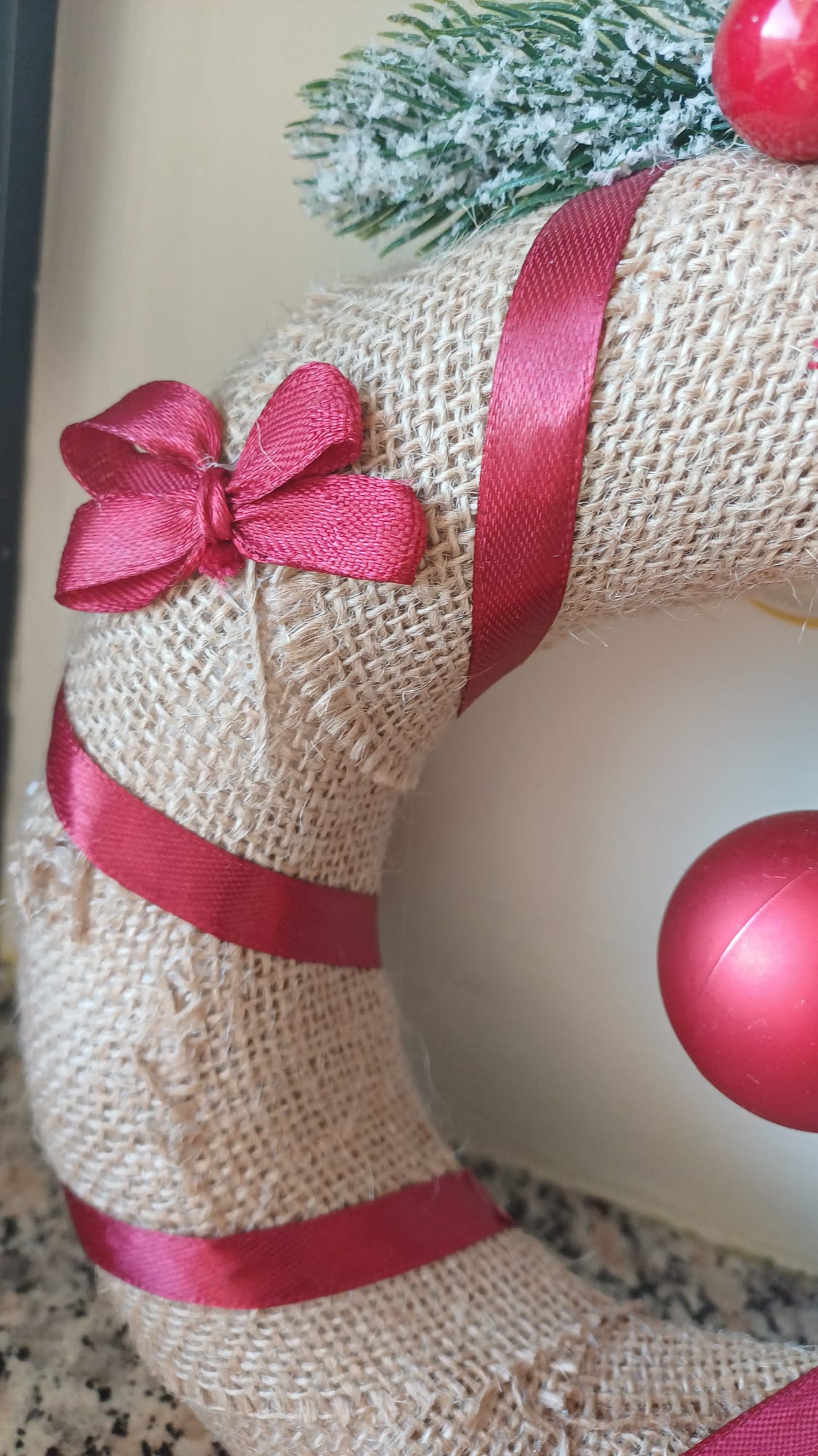 Una splendida ghirlanda natalizia fatta a mano che unisce il calore della juta naturale all'eleganza delle decorazioni rosse, perfetta per accogliere i tuoi ospiti con stile durante le feste.