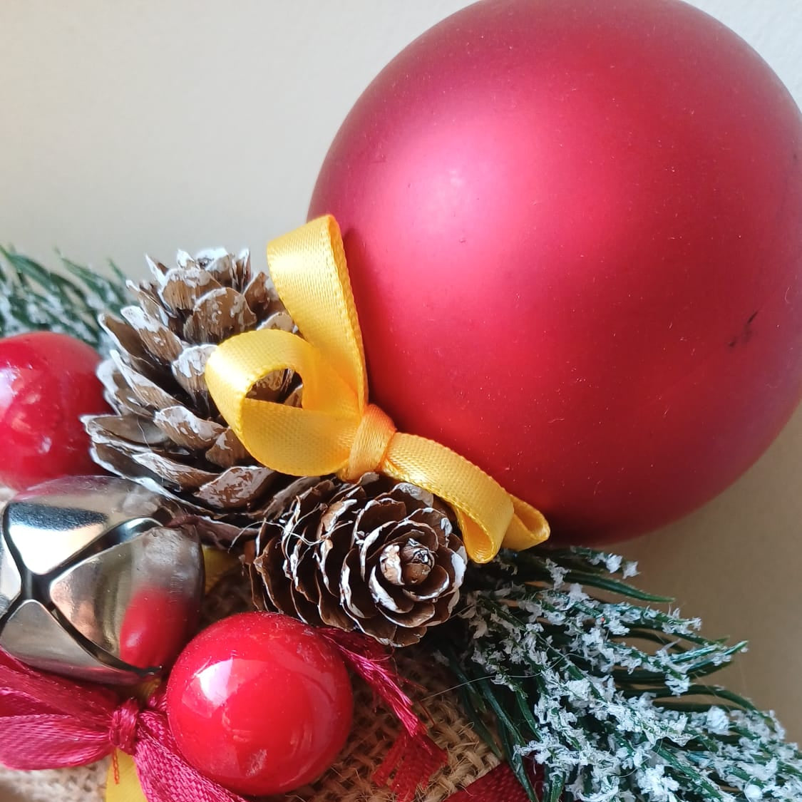 Realizzata artigianalmente con cura e attenzione ai dettagli, questa ghirlanda presenta una base in juta intrecciata impreziosita da nastri rossi in raso, pigne naturali, rametti di pino innevati e sfere natalizie rosse lucide.