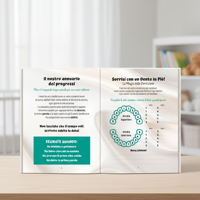 Questo diario è il compagno ideale per documentare tutti i progressi del vostro bambino dai 6 ai 12 mesi: dallo svezzamento ai primi dentini, dai primi gattonamenti ai primi passi.