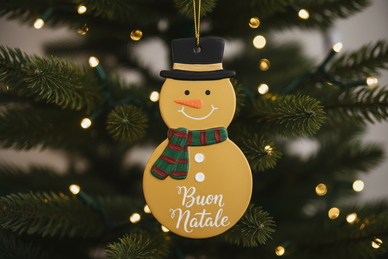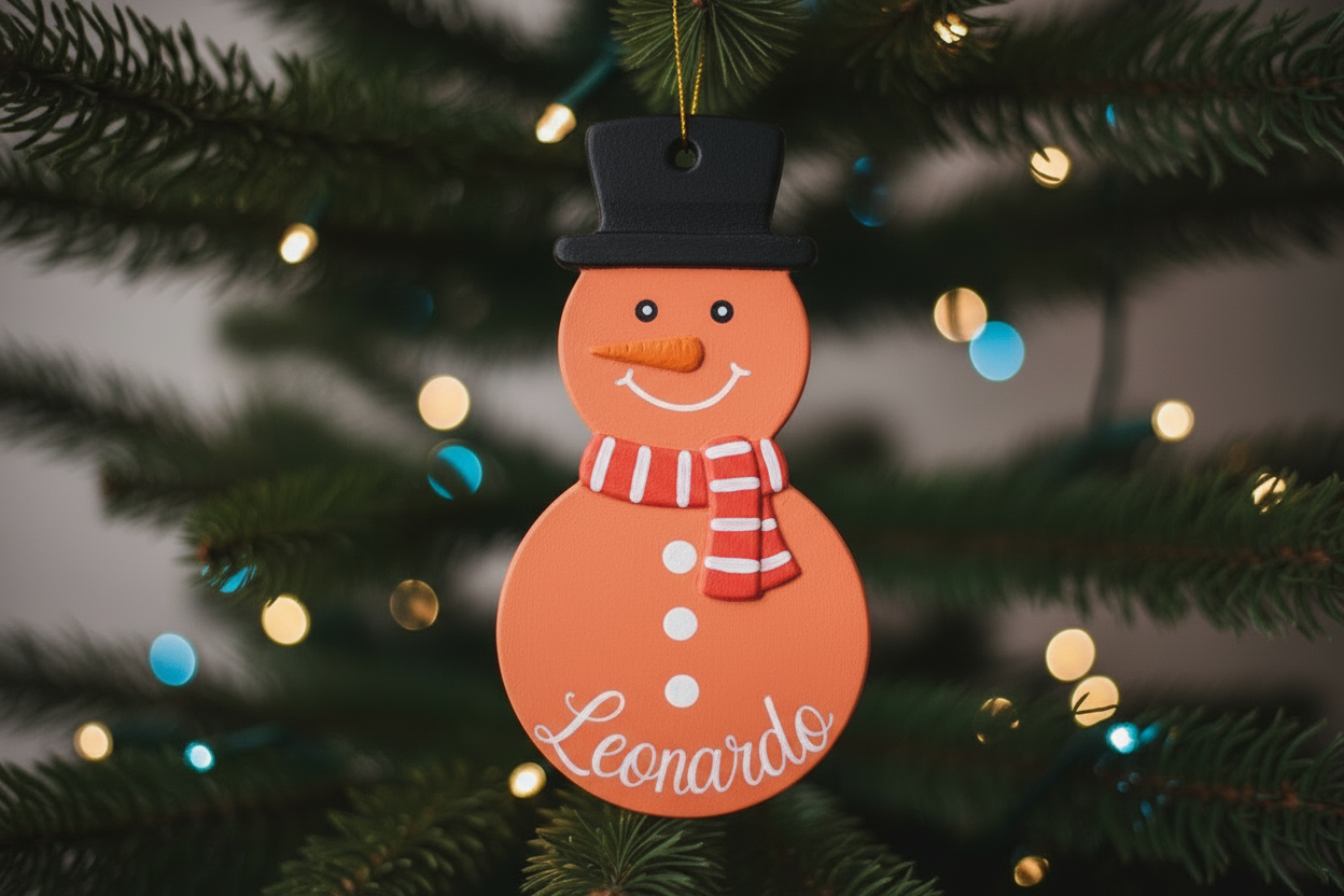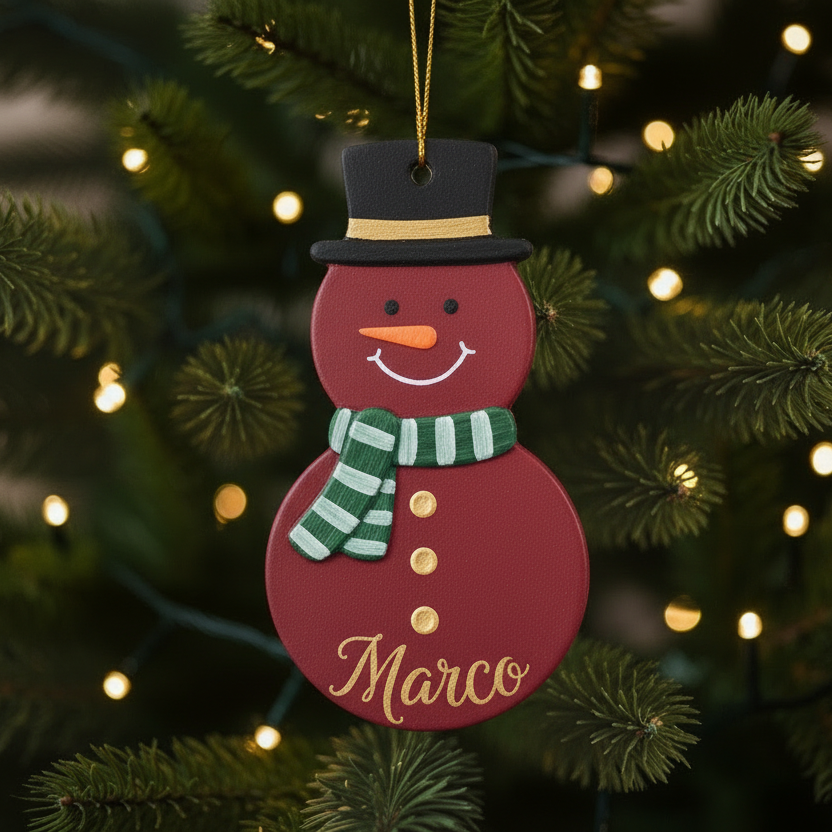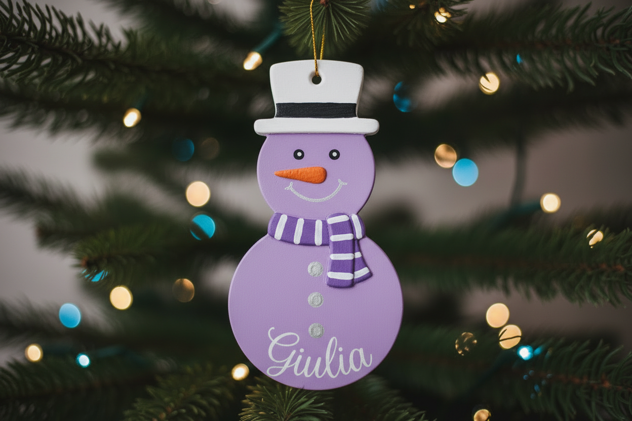 Scegli il colore del pupazzo e aggiungi il nome o la scritta che preferisci (es. "Mamma", "Papà", "Chiara", "Buon Natale") in elegante corsivo dorato, argentato o rose gold. Perfetto per creare un ricordo speciale delle feste!