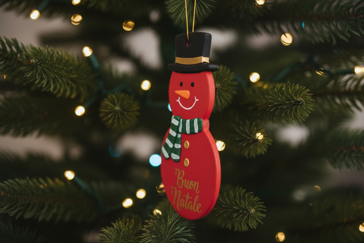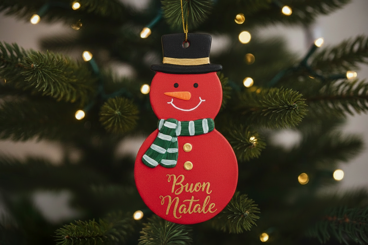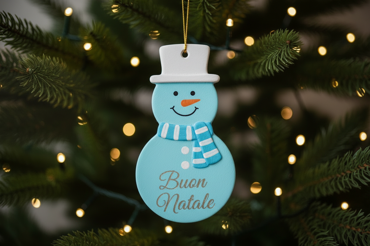 Scegli il colore del pupazzo e aggiungi il nome o la scritta che preferisci (es. "Mamma", "Papà", "Chiara", "Buon Natale") in elegante corsivo dorato, argentato o rose gold. Perfetto per creare un ricordo speciale delle feste!