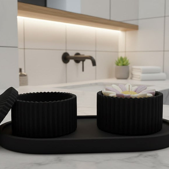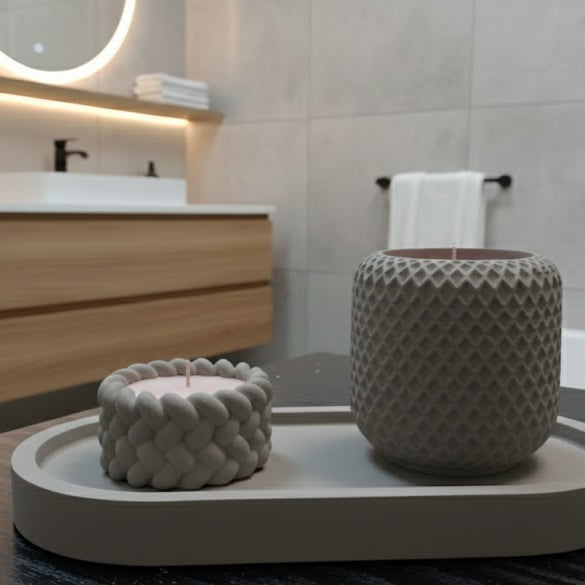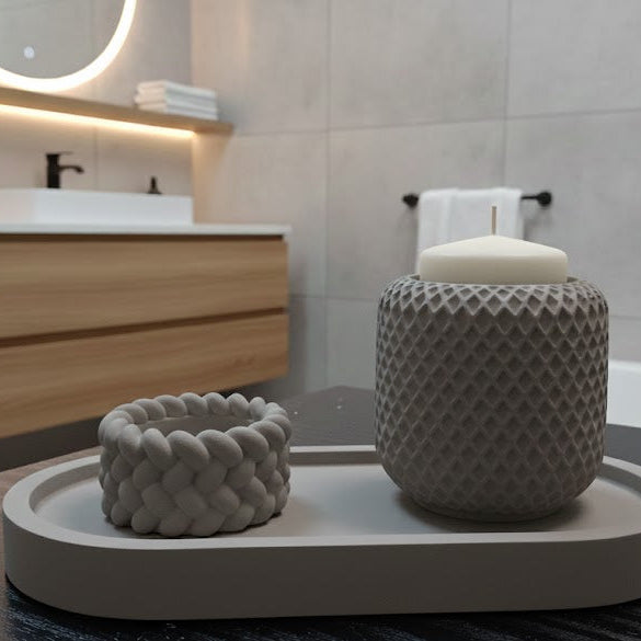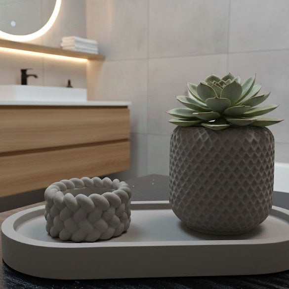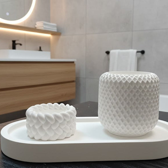 Scopri la versatilità di questi eleganti contenitori in gesso bianco con texture decorativa a rilievo e bordo smerlato. Set completo da due pezzi (una misura grande e una piccola) su vassoio ovale coordinato.