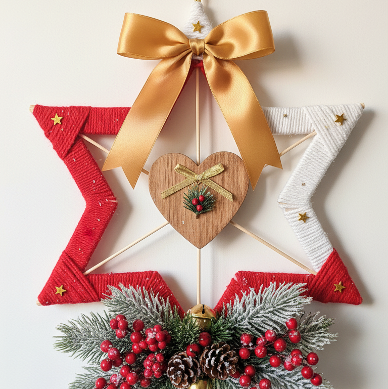 Una splendida stella natalizia fatta a mano che unisce il calore dei colori tradizionali rosso e bianco all'eleganza di decorazioni raffinate, perfetta per accogliere i tuoi ospiti con stile durante le feste.