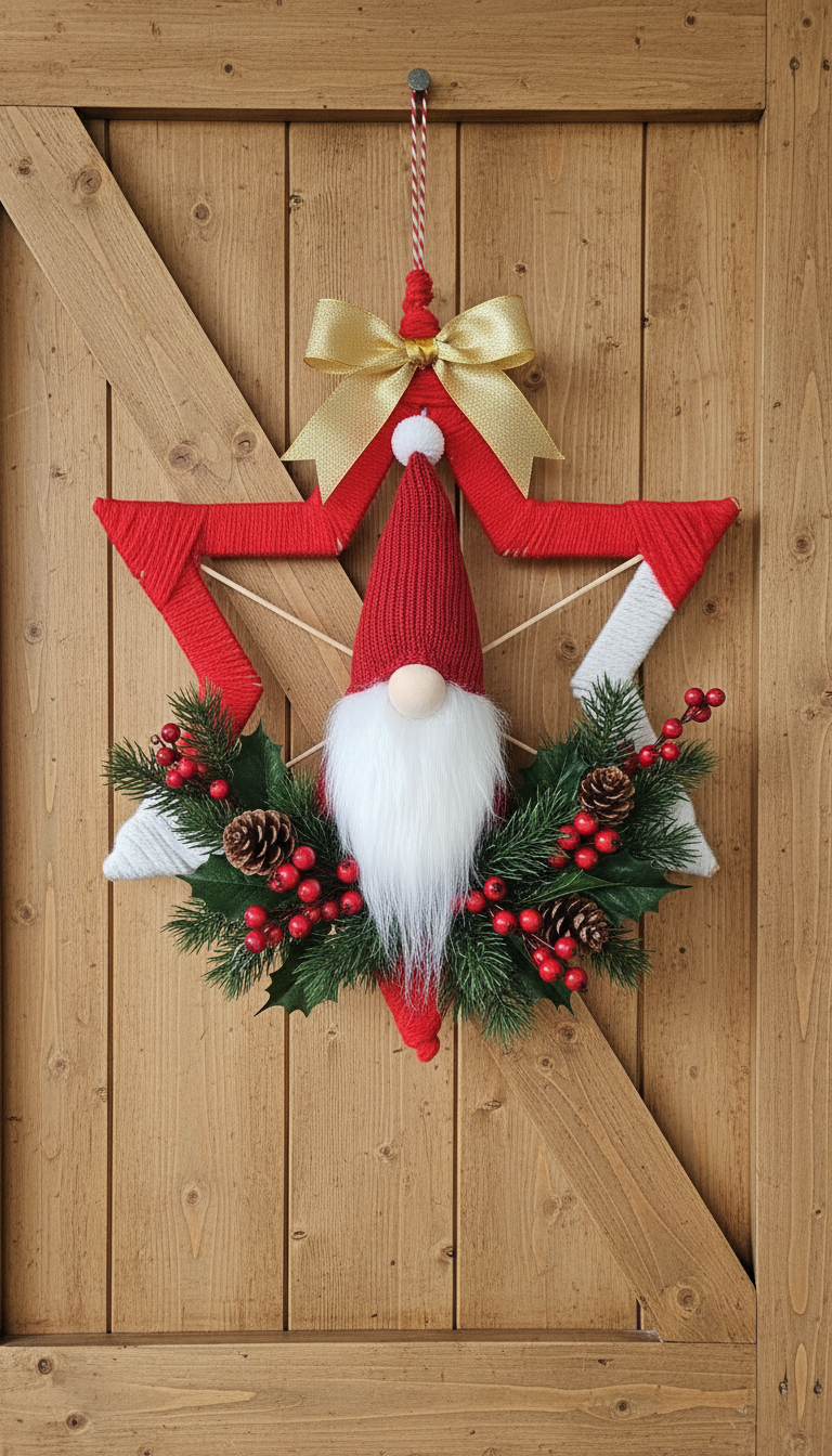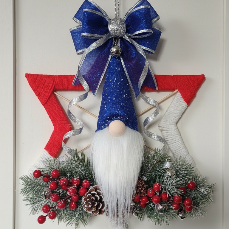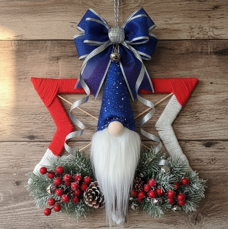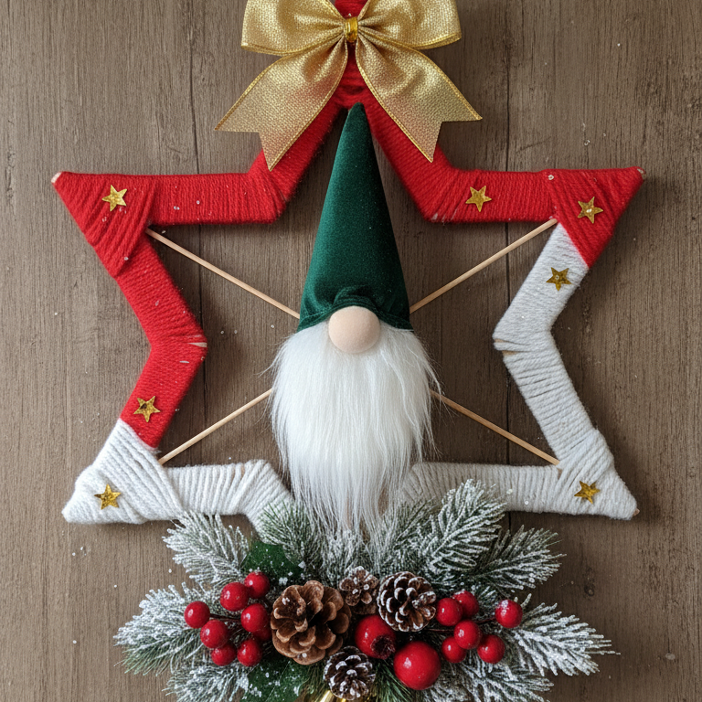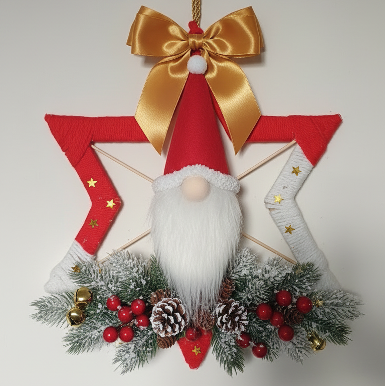 Realizzata artigianalmente con cura e attenzione ai dettagli, questa stella presenta una struttura in legno rivestita con lana intrecciata a mano con sezioni rosse e bianche alternate, impreziosita da una decorazione centrale che può variare: gnomo natalizio, targhetta "Buon Natale" in legno, cuore decorativo o altri elementi a tema natalizio.