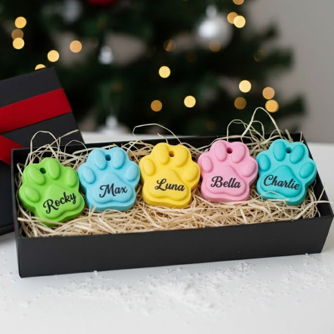 Scegli il colore della zampetta (rosa, azzurro, lavanda, verde, giallo, turchese, bianco, ecc.) e aggiungi il nome del tuo cane in elegante corsivo nero. Perfetto per creare un ricordo speciale del tuo amico peloso!